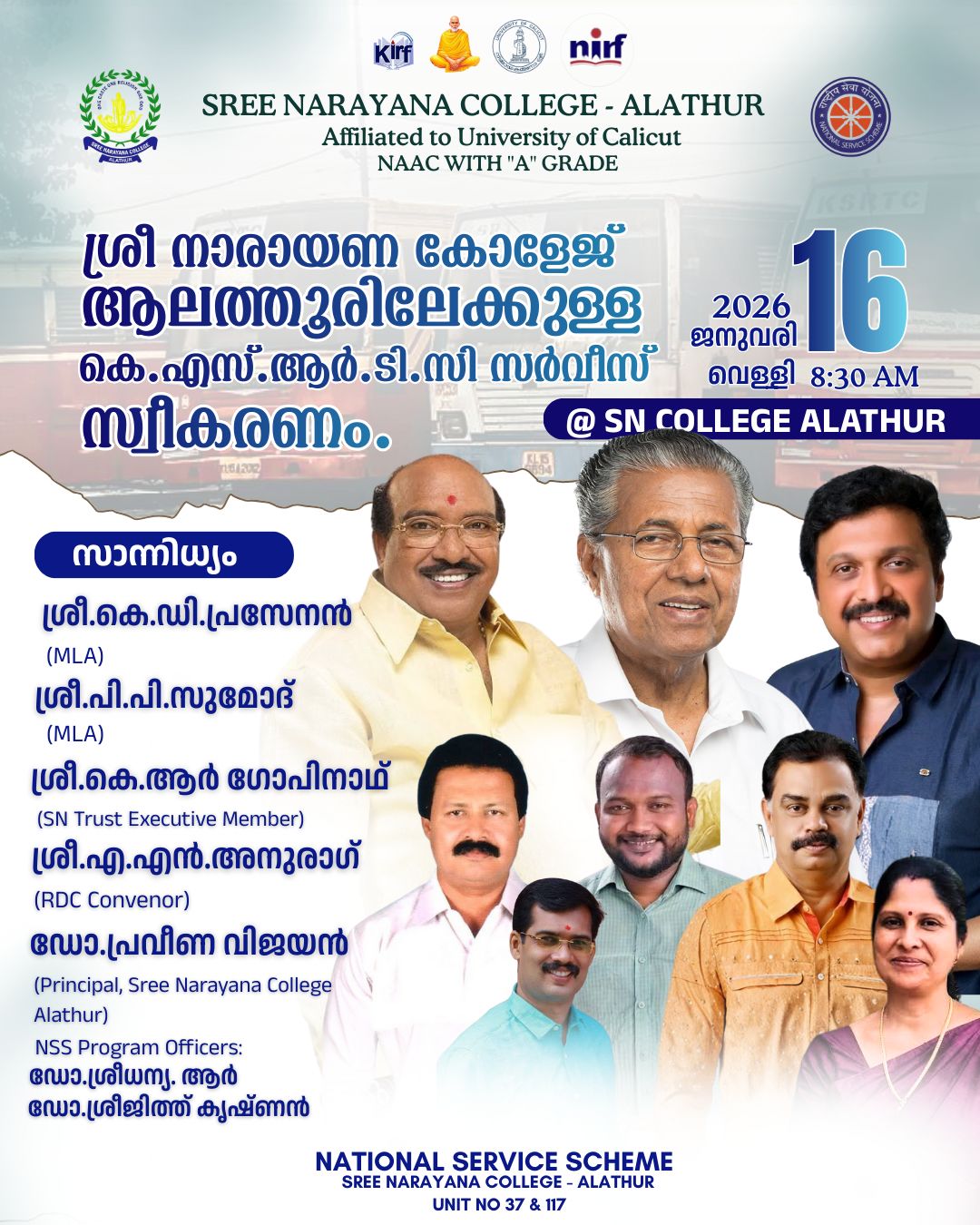 Read Moreഅലത്തൂർ:ശ്രീ നാരായണ കോളേജ്, അലത്തൂർ, ക്വിസ് ക്ലബ്ബിന്റെയും IQAC-യുടെയും ആഭിമുഖ്യത്തിൽ ചീഫ് മിനിസ്റ്റർസ് മെഗാ ക്വിസ് (കോളേജ് തല) 2026 ജനുവരി 12-ന് രാവിലെ 11.00 മണിക്ക്...