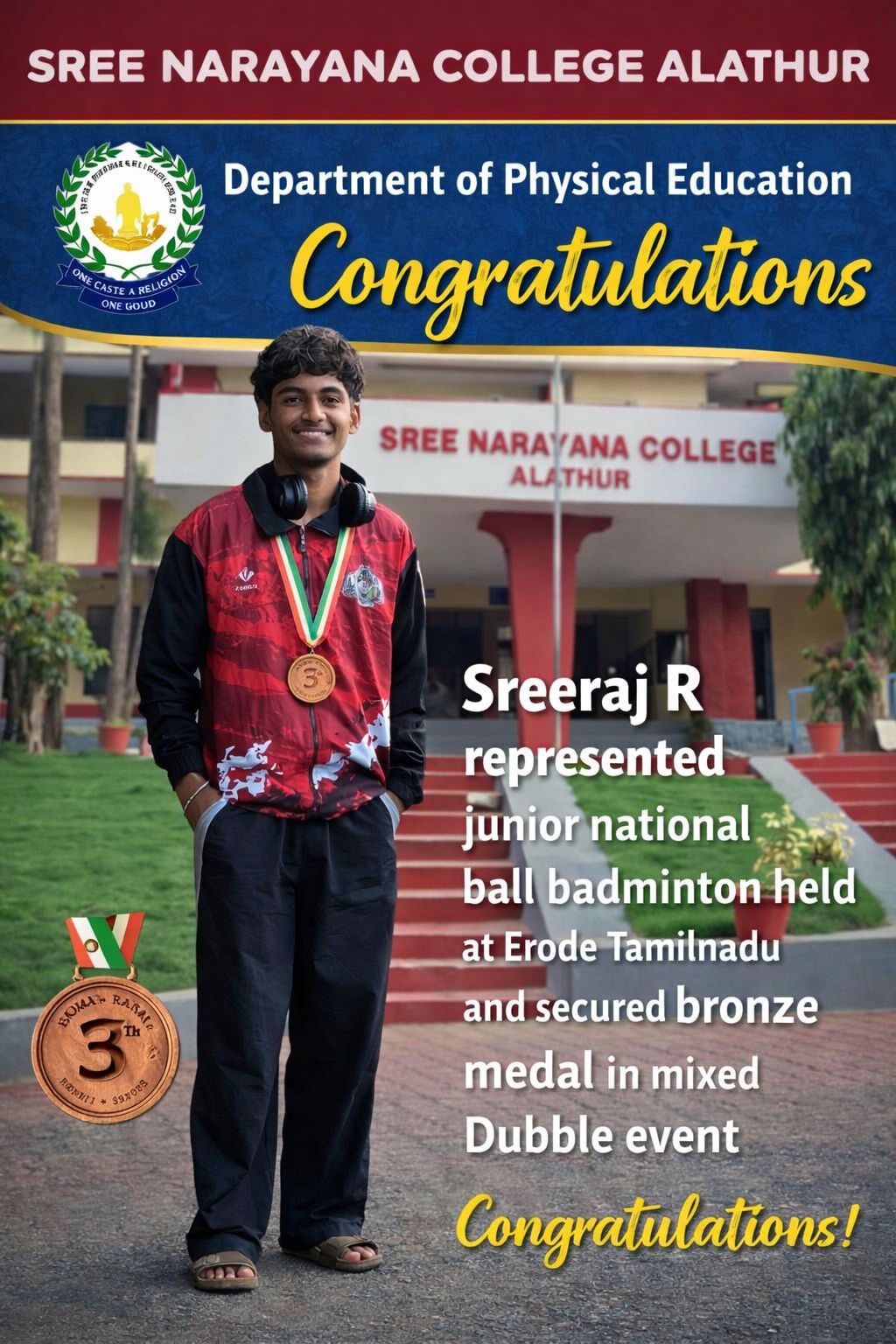 Read MoreSreeraj R Wins Bronze Medal at Junior National Ball Badminton Championship Sree Narayana College, Alathur, proudly congratulates Sreeraj R, a...