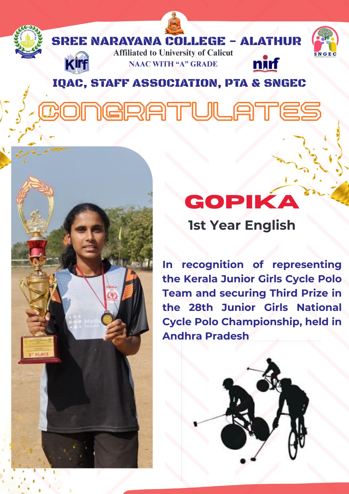 S. N. College Student Brings National-Level Recognition in Cycle Polo Sree Narayana College, Alathur, proudly announces that Gopika, a first-year...