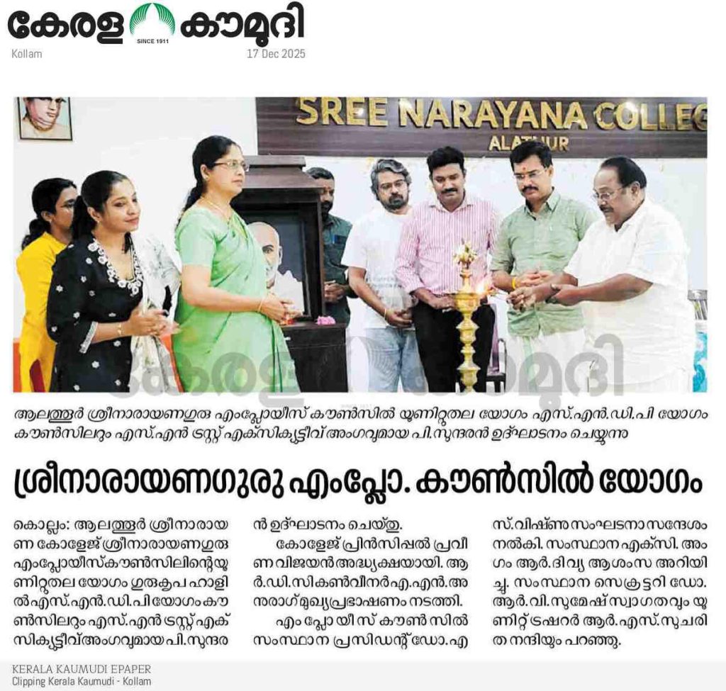ശ്രീനാരായണഗുരു എംപ്ലോയീസ് കൗണ്സിലിന്റെ യൂണിറ്റ്തല യോഗം 15.12.2025 നു ഗുരുകൃപ ഹാളിൽ വച്ച് നടന്നു. എസ്സ് എൻ ഡി പി യോഗം കൗൺസിലറും, എസ്സ് എൻ ട്രസ്റ്റ് എക്സിക്യൂട്ടീവ് അംഗവും ശ്രീനാരായണഗുരു എംപ്ലോയീസ് കൗൺസിലിൻ്റെ ചാർജ് വഹിക്കുന്ന ശ്രീ പി സുന്ദരൻ യോഗം ഉദ്ഘാടനം ചെയ്തു, ആർ ഡി സി കൺവീനർ ശ്രീ എ എൻ അനുരാഗ് മുഖ്യപ്രഭാഷണം നടത്തി. ശ്രീനാരായണഗുരു എംപ്ലോയീസ് കൗൺസിൽ സംസ്ഥാന പ്രസിഡണ്ട് ഡോ എസ് വിഷ്ണു സംഘടനാ സന്ദേശം നടത്തി. കോളേജ് പ്രിൻസിൽപ്പൽ ശ്രീമതി പ്രവീണ വിജയൻ അധ്യക്ഷത വഹിച്ച ചടങ്ങിന്, ശ്രീനാരായണഗുരു എംപ്ലോയീസ് കൗൺസിൽ സംസ്ഥാന സെക്രട്ടറി ഡോ സുമേഷ് ആർ വി സ്വാഗതവും, സംസ്ഥാന എക്സിക്യൂട്ടീവ് അംഗം ശ്രീമതി ദിവ്യ ആർ ആശംസയും, യൂണിറ്റ് ട്രഷറർ ശ്രീമതി സുചരിത ആർ എസ് നന്ദി രേഖപ്പെടുത്തി. വയനാട് വെച്ച് നടന്ന എ എഫ് ഐ മാസ്റ്റേഴ്സ് അത്ലറ്റിക്സിൽ ജാവലിൻ ത്രോ മത്സരത്തിൽ ഒന്നാം സ്ഥാനവും ഗോൾഡ് മെഡൽ നേടുകയും, ചെന്നെയിൽ വച്ച് നടന്ന ഏഷ്യൻ ഗെയിംസിൽ മൂന്നാം സ്ഥാനവും വെങ്കലമെഡൽ കരസ്ഥമാക്കുകയും, സ്വീഡനിൽ വെച്ച് നടക്കുന്ന മാസ്റ്റേഴ്സ് മീറ്റിൽ സെലക്ഷനും നേടിയ ഫിസിക്കൽ എഡ്യൂക്കേഷൻ അധ്യാപകനായ ഡോ അനീഷ് രാജപ്പൻ, നാച്ചുറൽ എക്സ്ട്രാക്ടിൽ നിന്ന് ടെർപ്പിനോയിഡുകൾ കണ്ടെത്തുന്നതിനും അളവ് നിർണയിക്കുന്നതിനുമായി നവീന ഉപകരണം രൂപകൽപ്പന ചെയ്ത് പേറ്റൻ്റ് നേടിയ ബോട്ടണി വിഭാഗം അസോസിയേറ്റ് പ്രൊഫസർ ആയ ഡോ. ബിനുമോൾ എം, കൊമേഴ്സിൽ ഡോക്ടറേറ്റ് നേടിയ ഡോ സുധീഷ് ടി വി എന്നിവരെ ആദരിച്ചു. മീറ്റിംഗിൽ നിരവധി അധ്യാപകരും അനധ്യാപകരും പങ്കെടുത്തു.