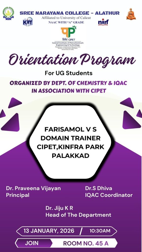 ശ്രീ നാരായണ കോളേജ്, അലത്തൂർ, രസതന്ത്ര വിഭാഗവും IQAC-യും സംയുക്തമായി CIPET (Central Institute of Petrochemicals Engineering & Technology) യുടെ സഹകരണത്തോടെ ബിരുദ വിദ്യാർത്ഥികൾക്കായി ഒരു ഓറിയന്റേഷൻ പ്രോഗ്രാം സംഘടിപ്പിക്കുന്നു.