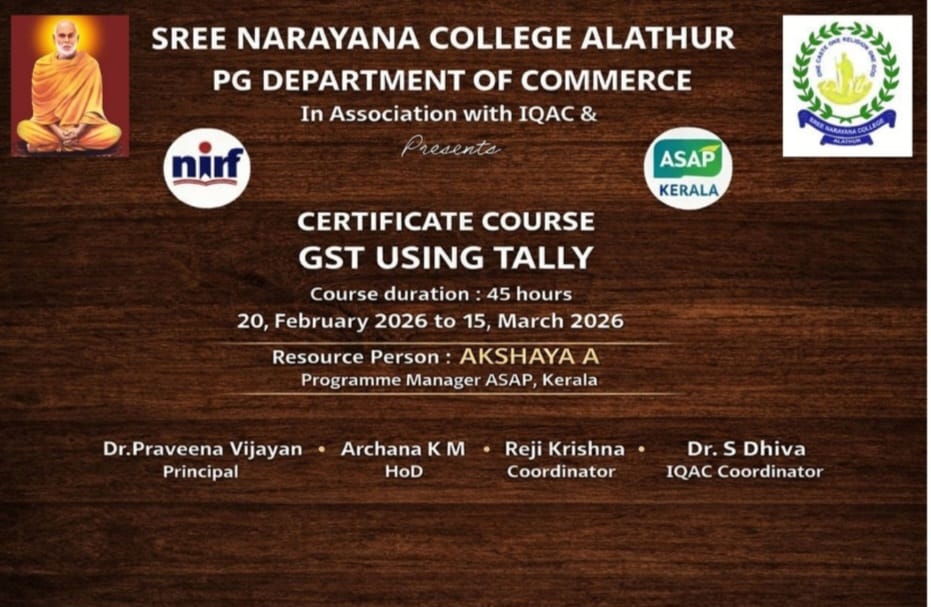 Read MoreCertificate Course on “GST Using Tally” to Begin at Sree Narayana College, Alathur The PG Department of Commerce, Sree Narayana...