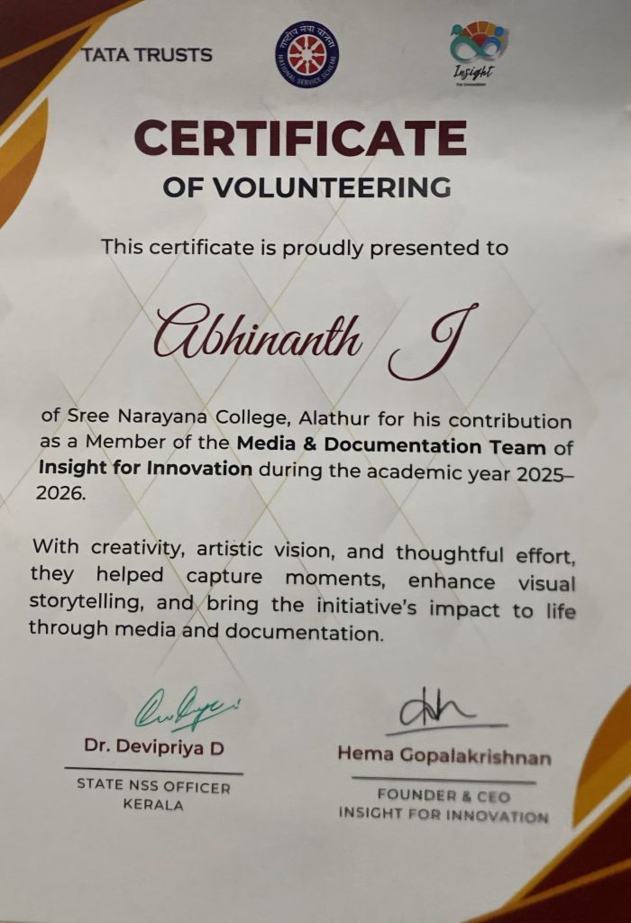 Abhinanth J, a student of Sree Narayana College Alathur, has been awarded a Certificate of Volunteering for his valuable contribution as a member of the Media & Documentation Team under the Volunteer Driven IESP initiative during the academic year 2025–2026.