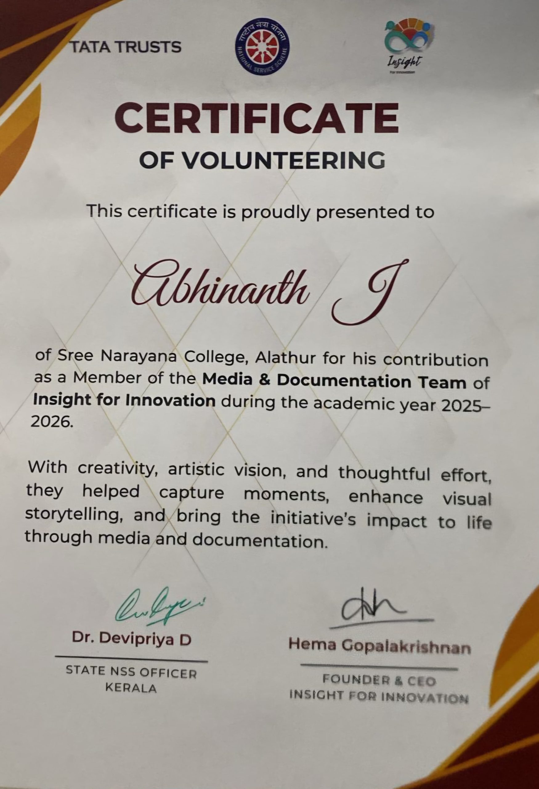 The certificate was signed by Dr. Devipriya D, State NSS Officer, Kerala, and Hema Gopalakrishnan, Founder and CEO of Insight for Innovation.