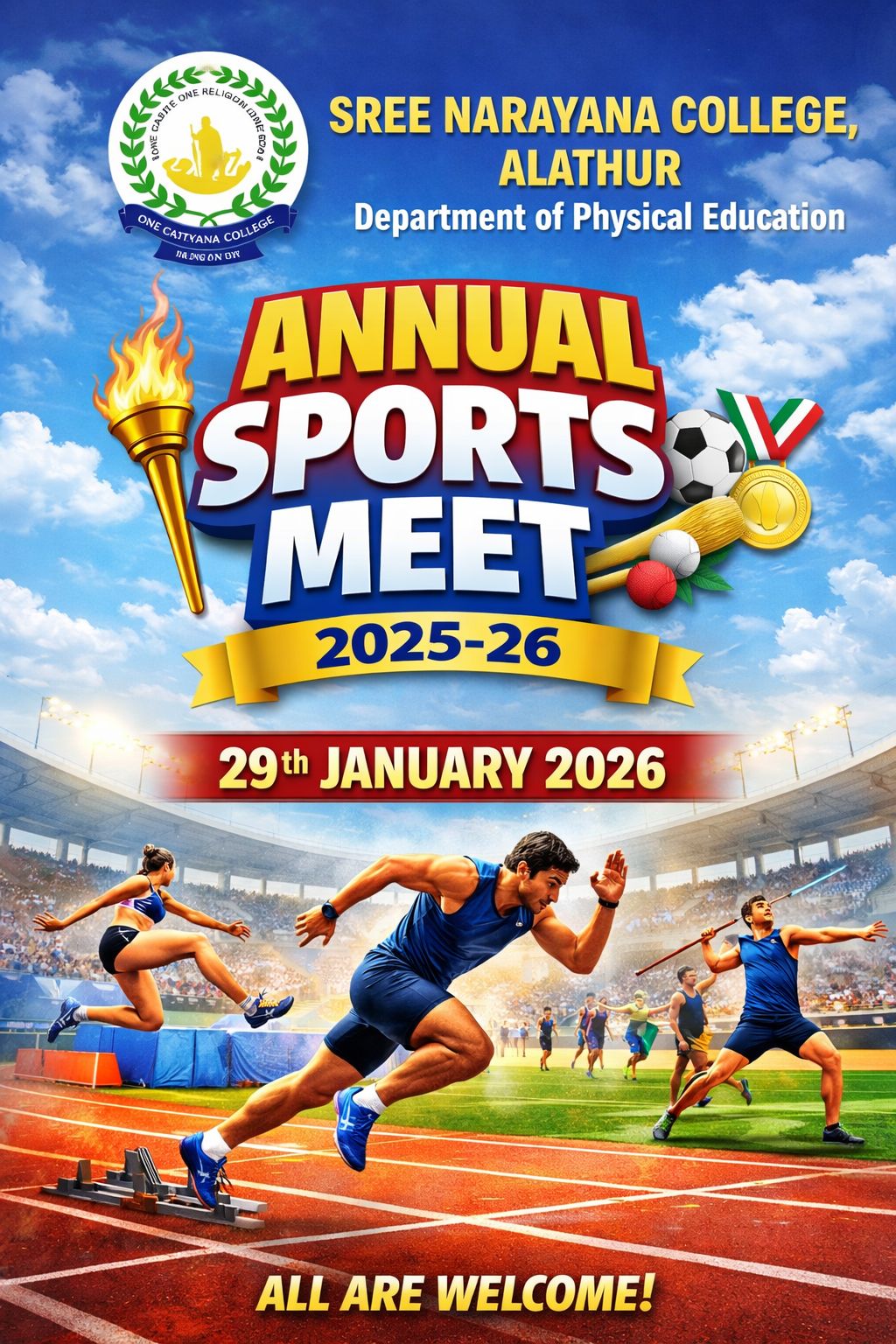 The Department of Physical Education, Sree Narayana College, Alathur, affiliated to the University of Calicut, will organise the Annual Sports Meet 2025–26 on 29 January 2026.