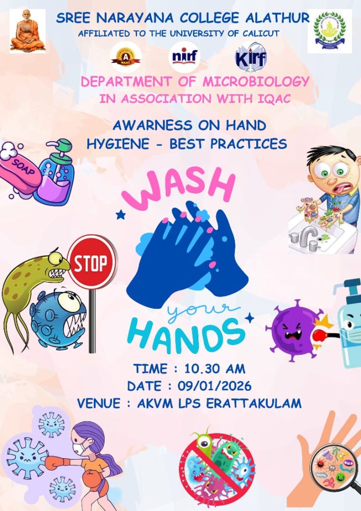 The Department of Microbiology, Sree Narayana College, Alathur, in association with the Internal Quality Assurance Cell (IQAC), organised an awareness programme on “Hand Hygiene – Best Practices” titled “Wash Your Hands” on 9 January 2026 at AKVM LPS, Erattakulam.