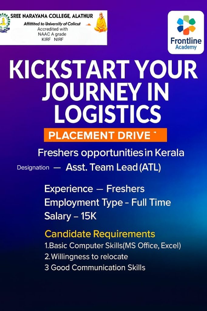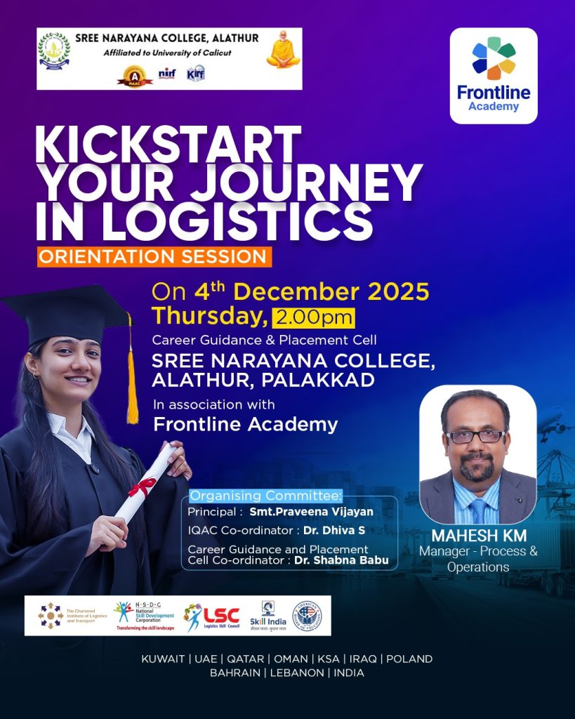 The Career Guidance and Placement Cell of Sree Narayana College, Alathur organized an Orientation Session and Placement Drive titled “Kickstart Your Journey in Logistics” on 4th December 2025, at 2.00 pm in the college campus. The programme was conducted in academic collaboration with Frontline Academy, a leading professional logistics training and placement agency operating internationally.
