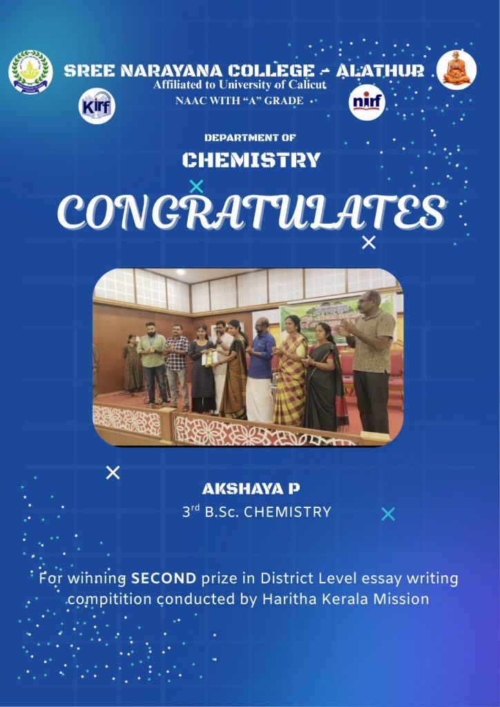 Akshaya P, a third-year B.Sc. Chemistry student, secured the Second Prize in the District-Level Essay Writing Competition conducted by the Haritha Kerala Mission. Her achievement highlights her academic excellence and commitment to environmental awareness.