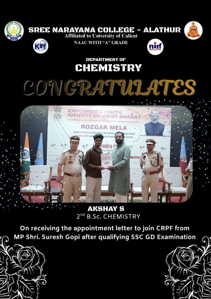 Adding to the department’s pride, Akshay S, a second-year B.Sc. Chemistry student, received his appointment letter to join the Central Reserve Police Force (CRPF) after successfully qualifying the SSC GD Examination. The appointment letter was formally handed over by MP Shri Suresh Gopi, marking a significant milestone in the student’s career.