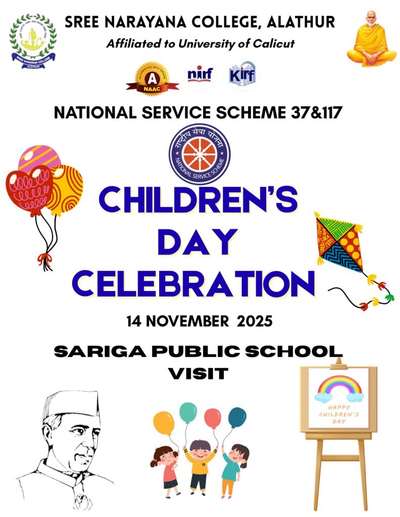 The National Service Scheme (NSS) Units 37 and 117 of Sree Narayana College, Alathur, organized a vibrant Children’s Day celebration at Sariga Public School on 14 November 2025. The programme was conducted as part of the college’s community outreach activities and witnessed active participation from NSS volunteers and school children.