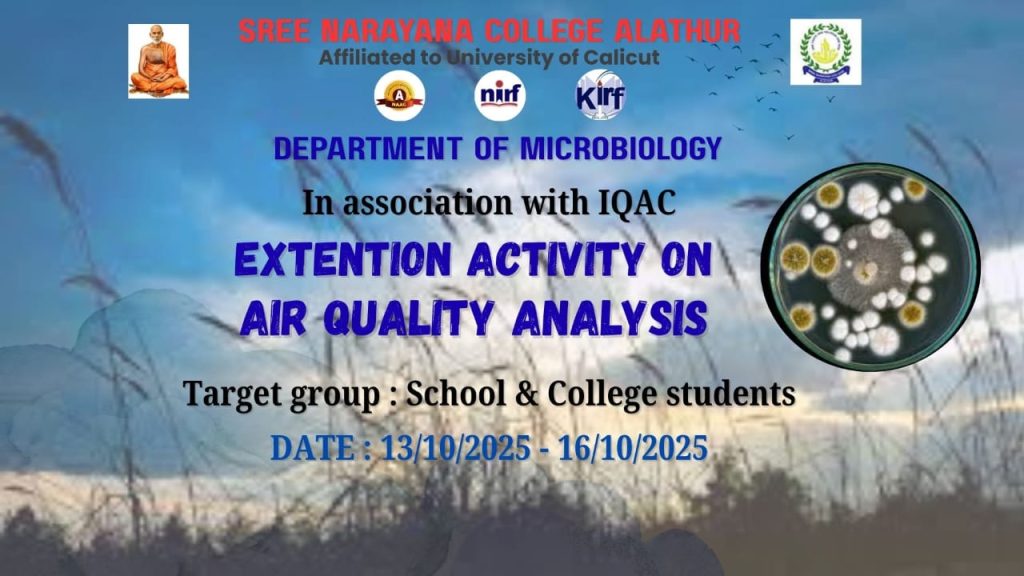 The Department of Microbiology, Sree Narayana College, Alathur, affiliated with the University of Calicut, organized an Extension Activity on “Air Quality Analysis” from October 13 to 16, 2025. The program was conducted as part of the department’s outreach initiatives to promote environmental awareness and scientific learning among students.