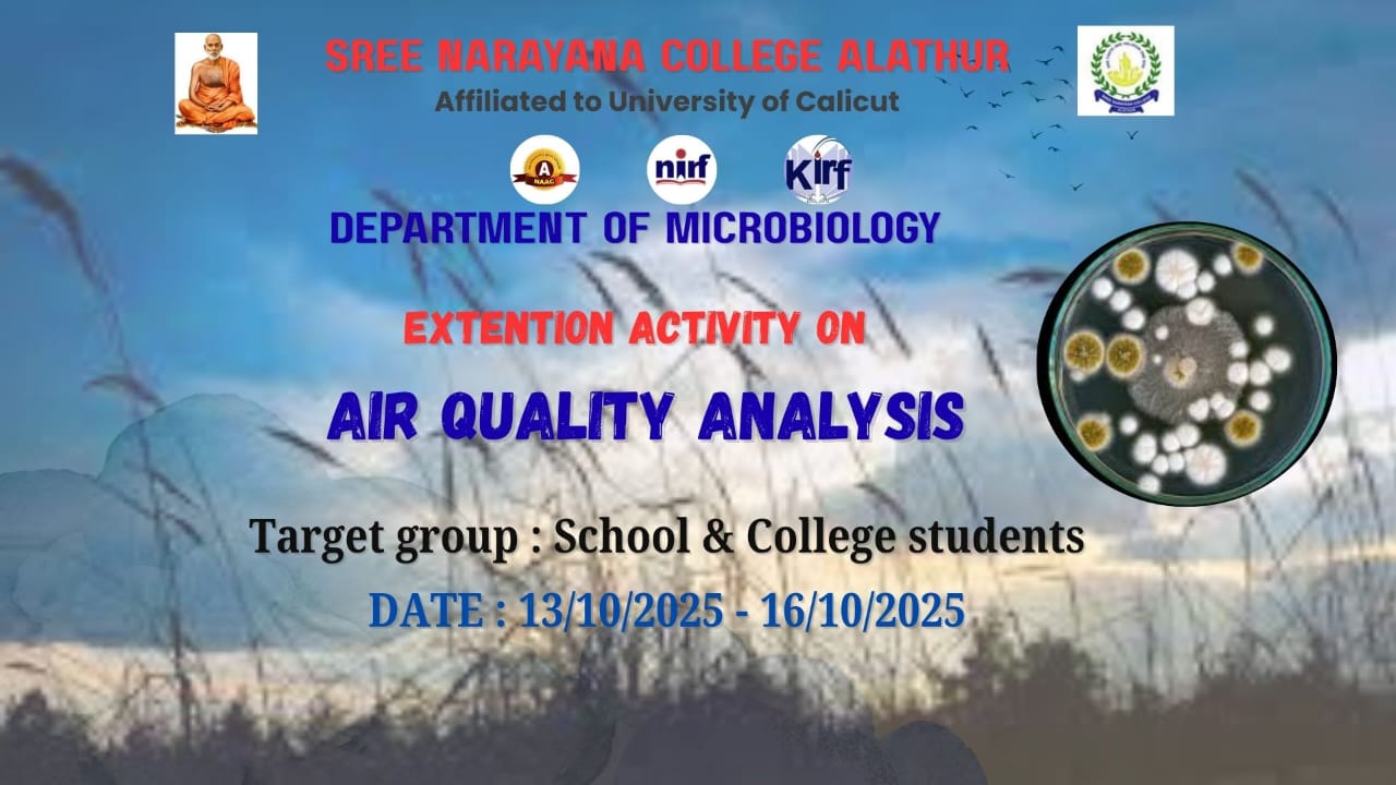 The Department of Microbiology, Sree Narayana College, Alathur, affiliated with the University of Calicut, organized an Extension Activity on “Air Quality Analysis” from October 13 to 16, 2025. The program was conducted as part of the department’s outreach initiatives to promote environmental awareness and scientific learning among students.