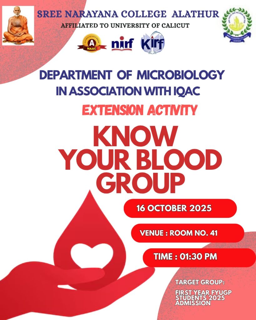 The Department of Microbiology, Sree Narayana College, Alathur, affiliated with the University of Calicut, conducted an Extension Activity titled “Know Your Blood Group” in association with IQAC on October 16, 2025, at Room No. 41.