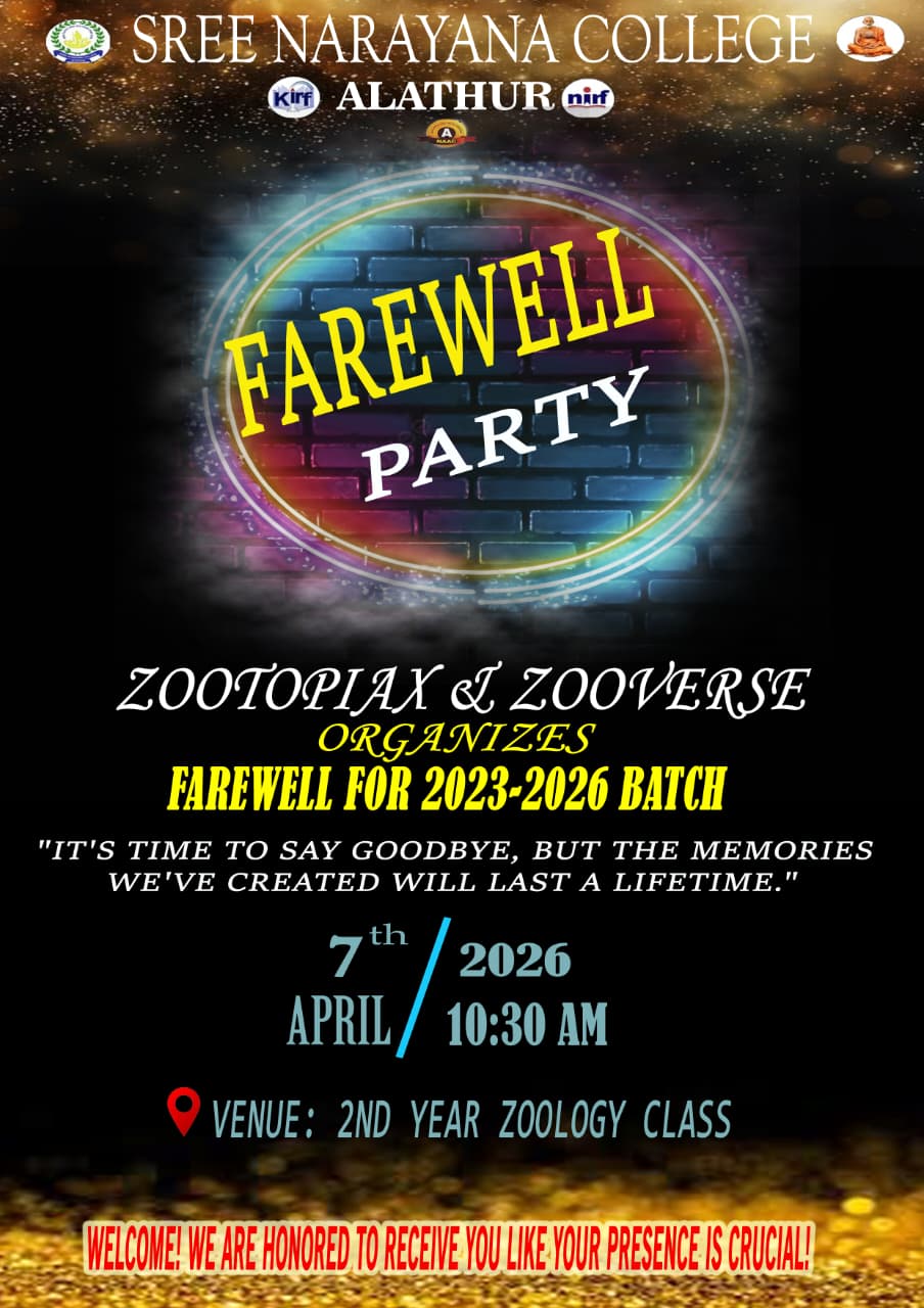 Alathur: Sree Narayana College is gearing up to host a vibrant farewell party for the outgoing Zoology batch (2023–2026) on April 7, 2026. The event, organized by Zoologians’ groups “Zootopiax” and “Zooverse,” will begin at 10:30 AM in the 2nd Year Zoology Classroom.