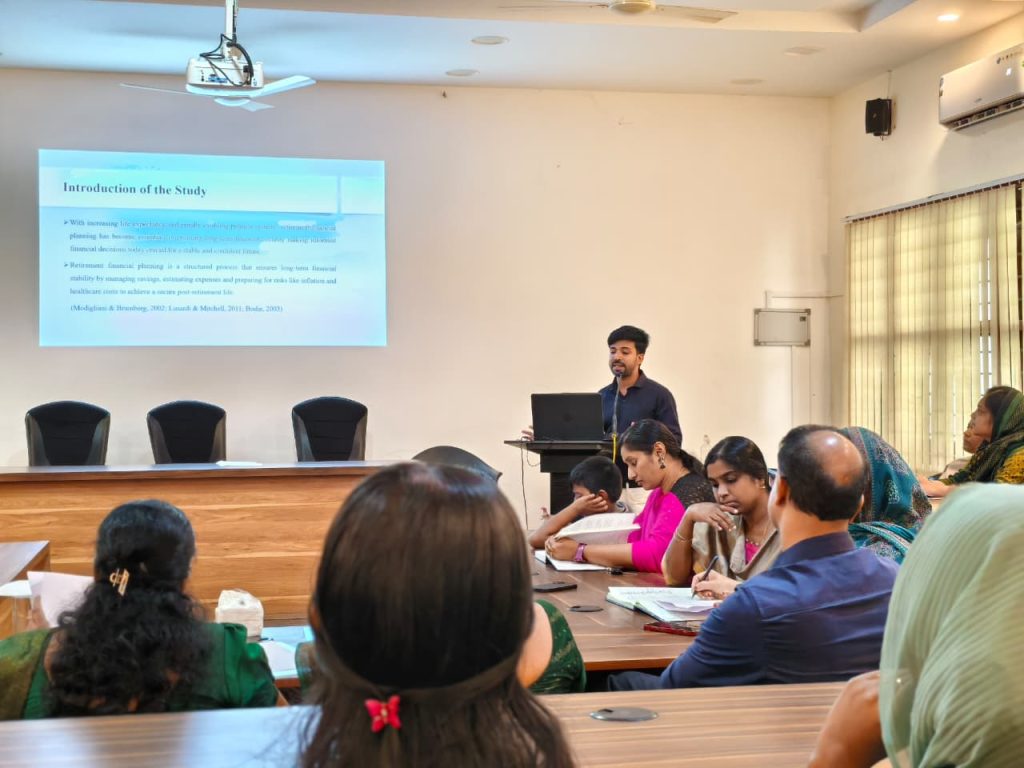 Dr. Princy Francis, Assistant Professor and Research Guide, along with Dr. Shiney C N, HoD, extended their appreciation and highlighted the academic merit and practical implications of the study. Principal Dr. Sanand C Sadananda Kumar congratulated the scholar for his hard-earned academic accomplishment and acknowledged the contribution of the research to policy discussions on pension reforms.