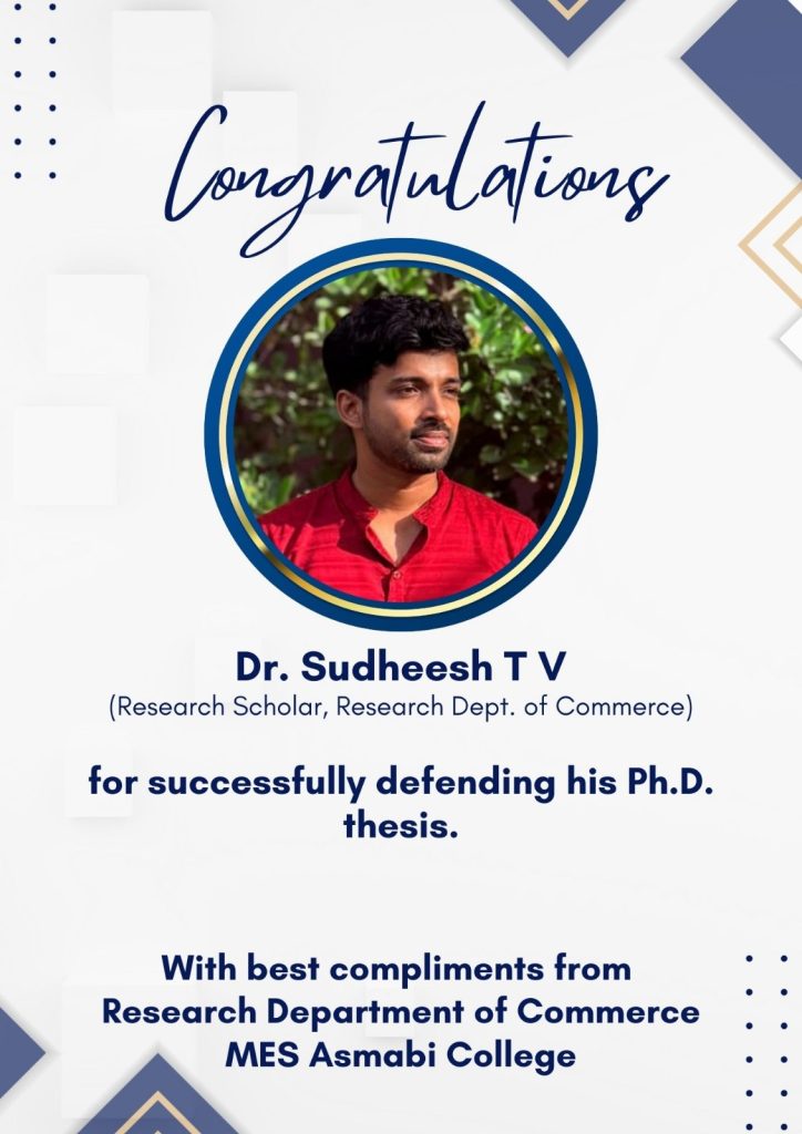 Dr. Sudheesh T V successfully defended his Ph.D. thesis, completing the requirements for his doctoral degree. The news of the successful completion and the title being officially awarded has brought immense pride to the institution.