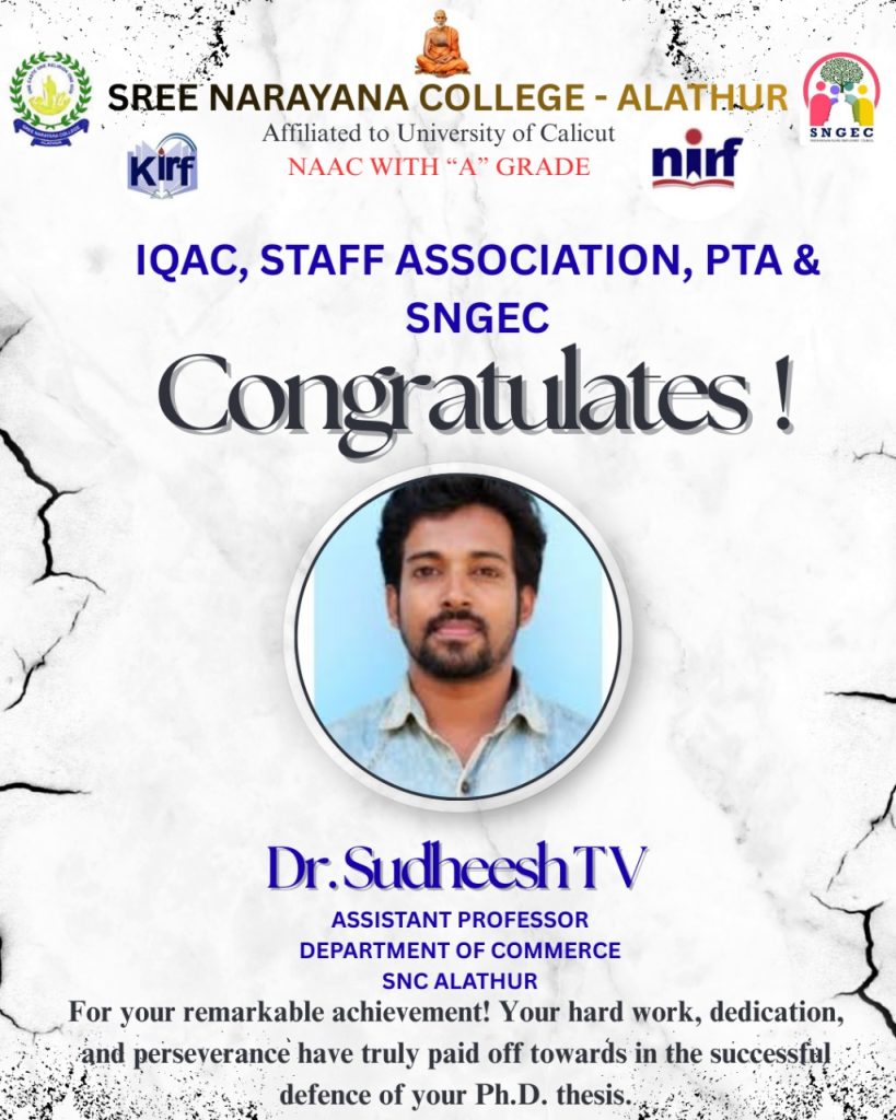ALATHUR, PALAKKAD – Sree Narayana College, Alathur, is celebrating the remarkable academic achievement of one of its faculty members, Dr. Sudheesh T V, Assistant Professor in the Department of Commerce.