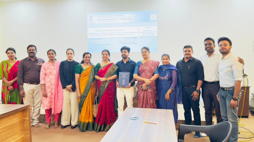 The Research Department of Commerce, MES Asmabi College, proudly announced the successful Ph.D. thesis defense of Dr. Sudheesh T V, Research Scholar, on Friday at 10:30 AM in the Conference Hall. Dr. Sudheesh T V, who also serves as an Assistant Professor at Sree Narayana College, Alathur, presented his doctoral research titled “Retirement Financial Planning Focusing National Pension System Among State Government Employees in Kerala.”
