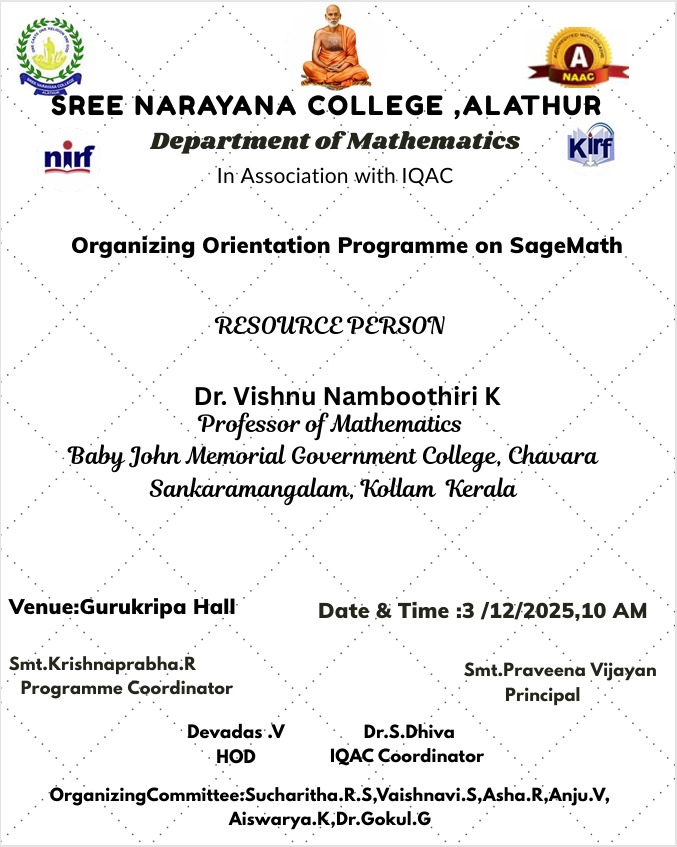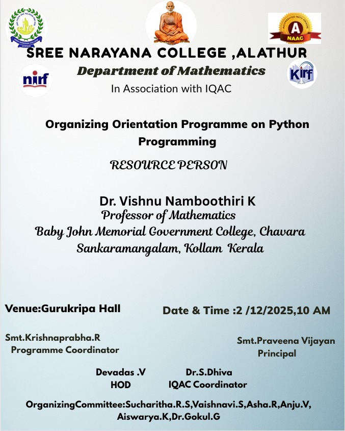 The Department of Mathematics, Sree Narayana College, Alathur, in association with the Internal Quality Assurance Cell (IQAC), is set to organize two significant Orientation Programmes aimed at enhancing computational skills among students.