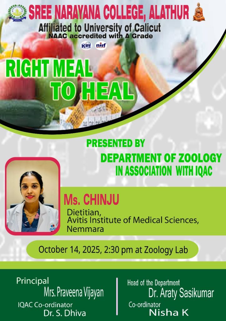 Alathur: The Department of Zoology, in association with the Internal Quality Assurance Cell (IQAC) of Sree Narayana College, Alathur, is organizing a health awareness program titled “Right Meal to Heal” on October 14, 2025, at 2:30 p.m. in the Zoology Lab.