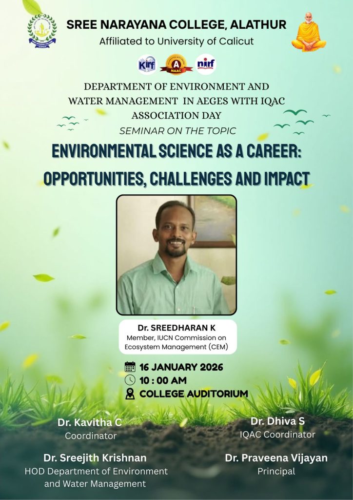 The Department of Environment and Water Management of Sree Narayana College, Alathur, in association with the Association of Environment and Geology Students (AEGES) and the Internal Quality Assurance Cell (IQAC), is organizing its Association Day Seminar on the topic “Environmental Science as a Career: Opportunities, Challenges and Impact.”