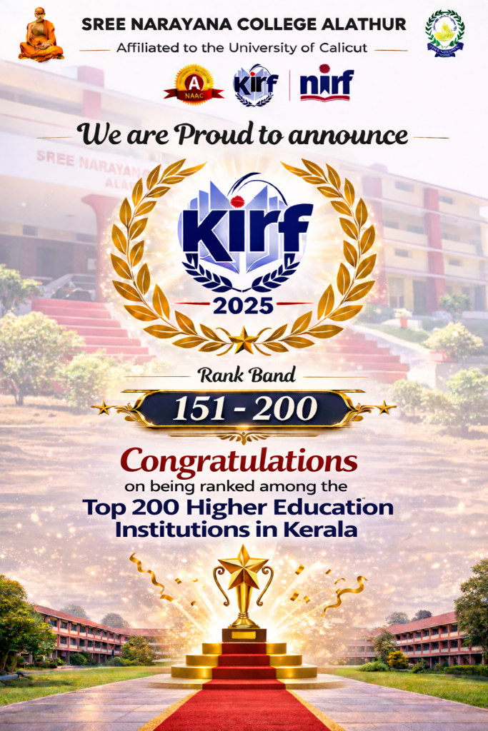 Alathur: Sree Narayana College Alathur has achieved a significant milestone by securing a place among the Top 200 Higher Education Institutions in Kerala in the KIRF 2025 rankings. The college has been placed in the prestigious Rank Band 151–200, marking another step forward in its journey of academic excellence.