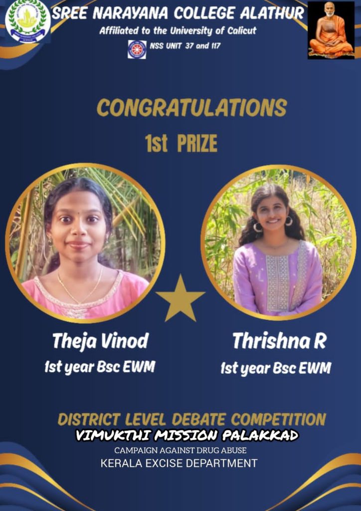 The students of Sree Narayana College, Alathur, brought pride to the institution by winning the First Prize in the District Level Debate Competition organized as part of the District-level Vimukthi Awareness Programme conducted by the Kerala Excise Department in association with the Vimukthi Mission. The event was held at Kudumbasree Hall, Alathur, on 29th October 2025.