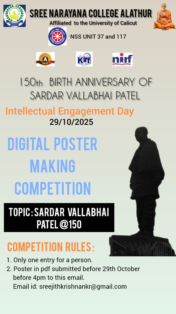 The NSS Units 37 and 117 of Sree Narayana College, Alathur, affiliated to the University of Calicut, will observe the 150th Birth Anniversary of Sardar Vallabhai Patel as part of the Intellectual Engagement Day celebrations on 29th October 2025.
