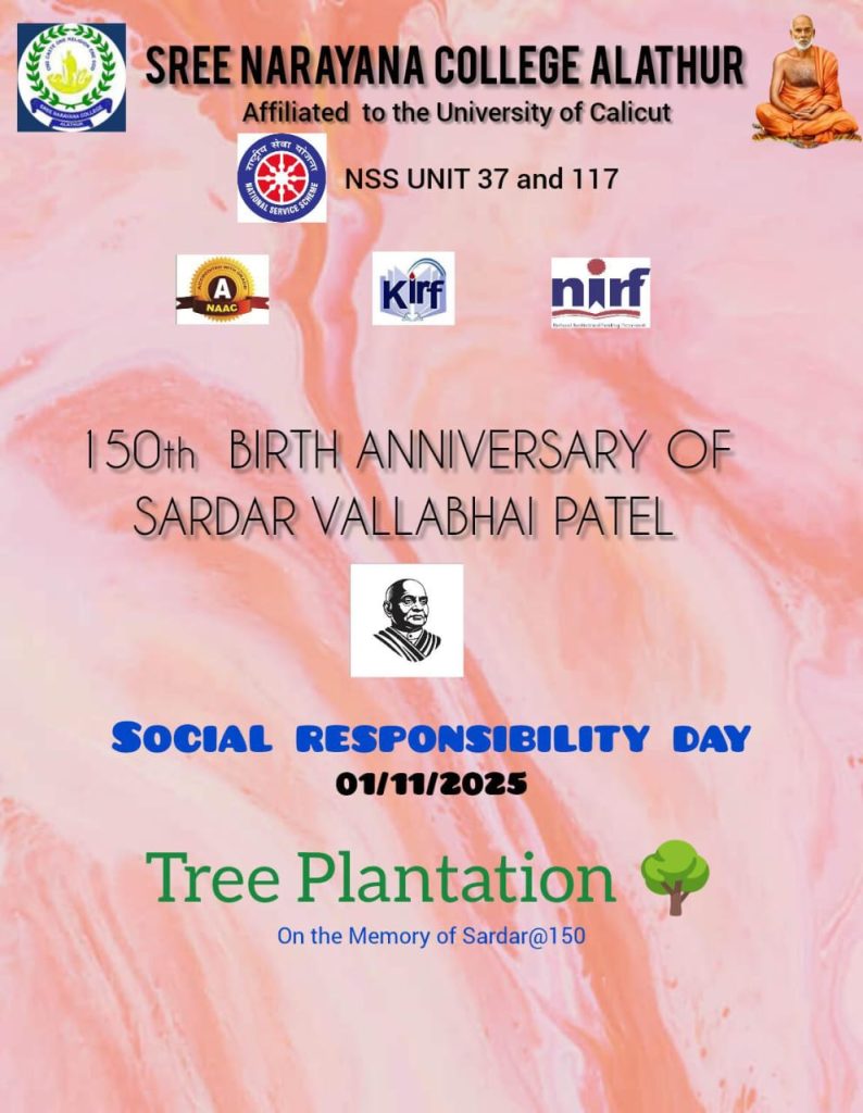 In connection with the 150th Birth Anniversary of Sardar Vallabhai Patel, the NSS Units 37 and 117 of Sree Narayana College, Alathur, affiliated to the University of Calicut, will observe Social Responsibility Day on November 1, 2025.