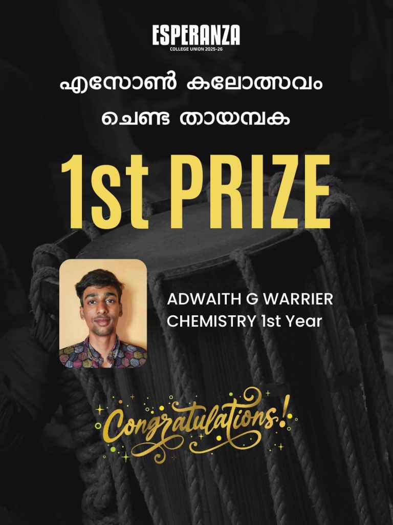 Adwaith G Warrier, first-year B.Sc. Chemistry student, won the First Prize in the Chenda Thayambaka competition, showcasing exceptional rhythmic skill and stage presence.
