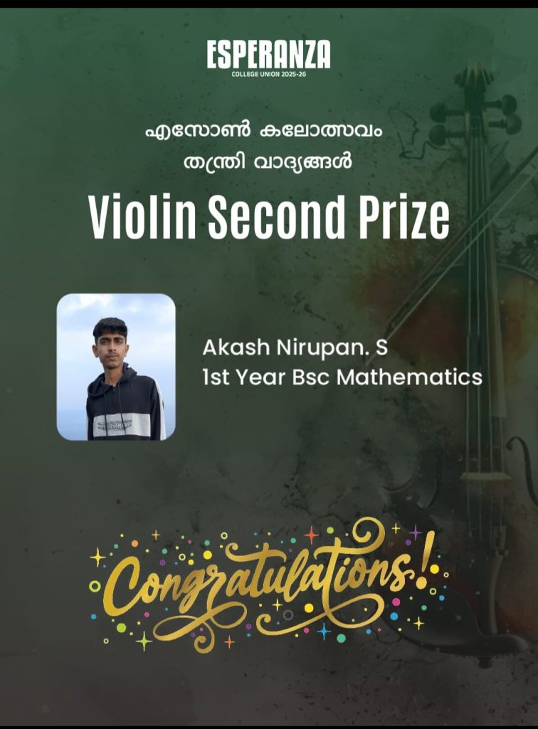 Adding to the celebrations, Akash Nirupan S, first-year B.Sc. Mathematics student, secured the Second Prize in Violin, impressing the audience and judges alike with his musical performance.