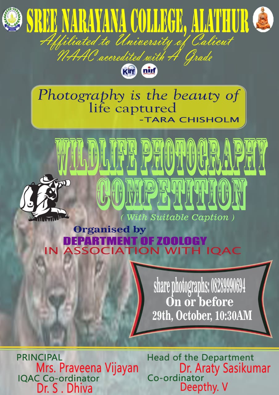 The Department of Zoology of Sree Narayana College, Alathur, in association with the Internal Quality Assurance Cell (IQAC), is organizing a Wildlife Photography Competition to celebrate the beauty and diversity of nature through the art of photography.